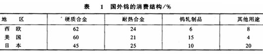 鎢是銀白色金屬,熔點(diǎn)高達(dá)3 400℃;鎢的硬度大、密度高、高溫強(qiáng)度好。鎢主要用于生產(chǎn)硬質(zhì)合金和鎢鐵。鎢與鉻、鉬、鈷組成耐熱耐磨合金用于制作刀具、金屬表層硬化材料、燃?xì)饫瓩C(jī)葉片。鎢與鉭、鈮、鉬等組成難熔合金。鎢銅和鎢銀合金用于電接觸材料。高密度的鎢鎳銅合金用作防輻射的防護(hù)屏,鎢絲、鎢棒、鎢片用于制作電燈泡、電子管的部件和電弧焊的電極。鎢的一些化合物可作熒光劑、顏料、染料等。鎢及其合金廣泛用于電子、電光源、航天以及武器(火箭噴管、穿甲彈芯)。見表1。