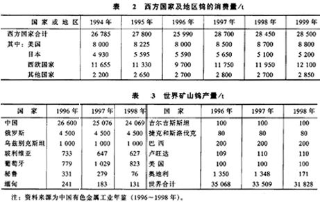 美國(guó)、日本、西歐是世界鎢的主要消費(fèi)國(guó),合計(jì)占世界總消費(fèi)量的60%-65%,但這些國(guó)家鎢精礦產(chǎn)量只能滿足需求量的12%一15%,大多靠進(jìn)口滿足需要,因而也是較重要的鎢進(jìn)口國(guó),中國(guó)是世界上較大的鎢供應(yīng)國(guó),這些國(guó)家也是中國(guó)鎢的較大市場(chǎng)。見表2和表3。